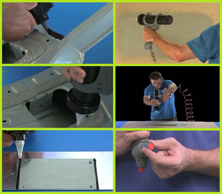適用于臘腸膠的滴施和噴施膠槍·符合人體工程學設計的手柄·平滑和可控的輸出·輕松調節控制滴施和噴施模式·易于使用和精確的壓力調節器·內置消音器