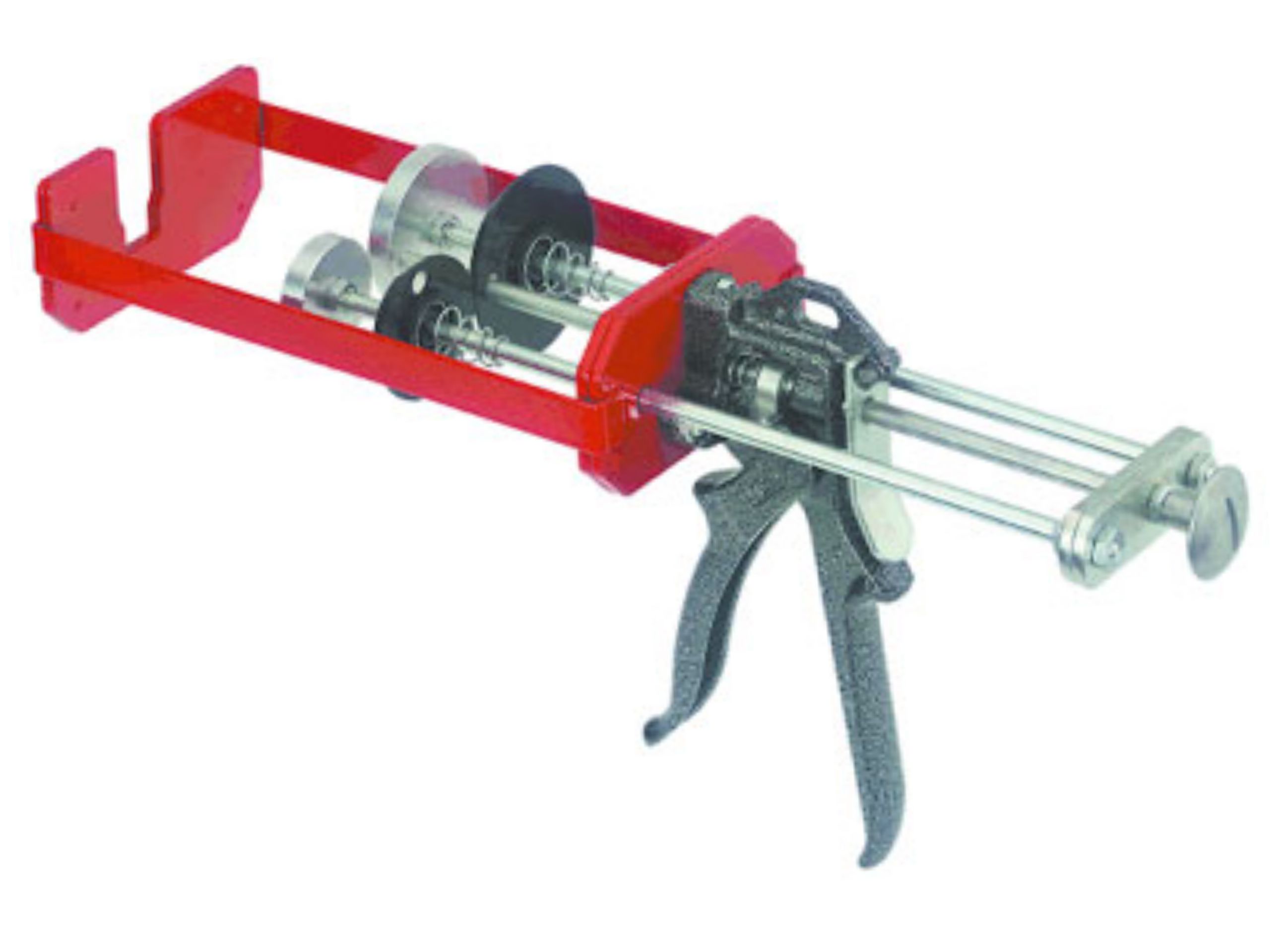 專門用于長膠筒的雙組份手動膠槍適用于長度為(214-217mm) 雙聯膠筒可用于600ml + 600ml (1:1) 雙聯膠筒可用于600ml + 300ml (2:1) 雙聯膠筒可用于600ml + 150ml (4:1) 雙聯膠筒可用于600ml + 75ml (8:1) 雙聯膠筒25:1扳機比率凈重2180g