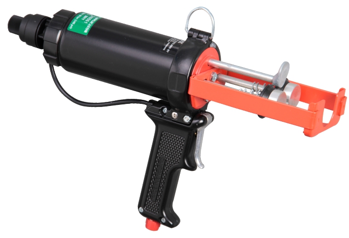 專門用于150ml Plas-Pak型膠筒的雙組份氣動膠槍用于150ml 1:1 (75+75ml) Plas-Pak 固定比率雙聯膠筒工作氣壓為6.8 bar時有2.20kN (220kgf)的推力重量1570g氣動復位為可選配置自動定心盤