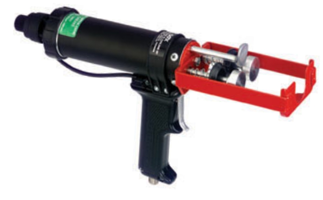專門用于150ml Plas-Pak型膠筒的雙組份氣動膠槍用于150ml 1:1 (75+75ml) Plas-Pak 固定率例雙聯(lián)膠筒工作氣壓為6.8 bar時有1.4kN (140kgf)的推力重量1240g自動定心盤